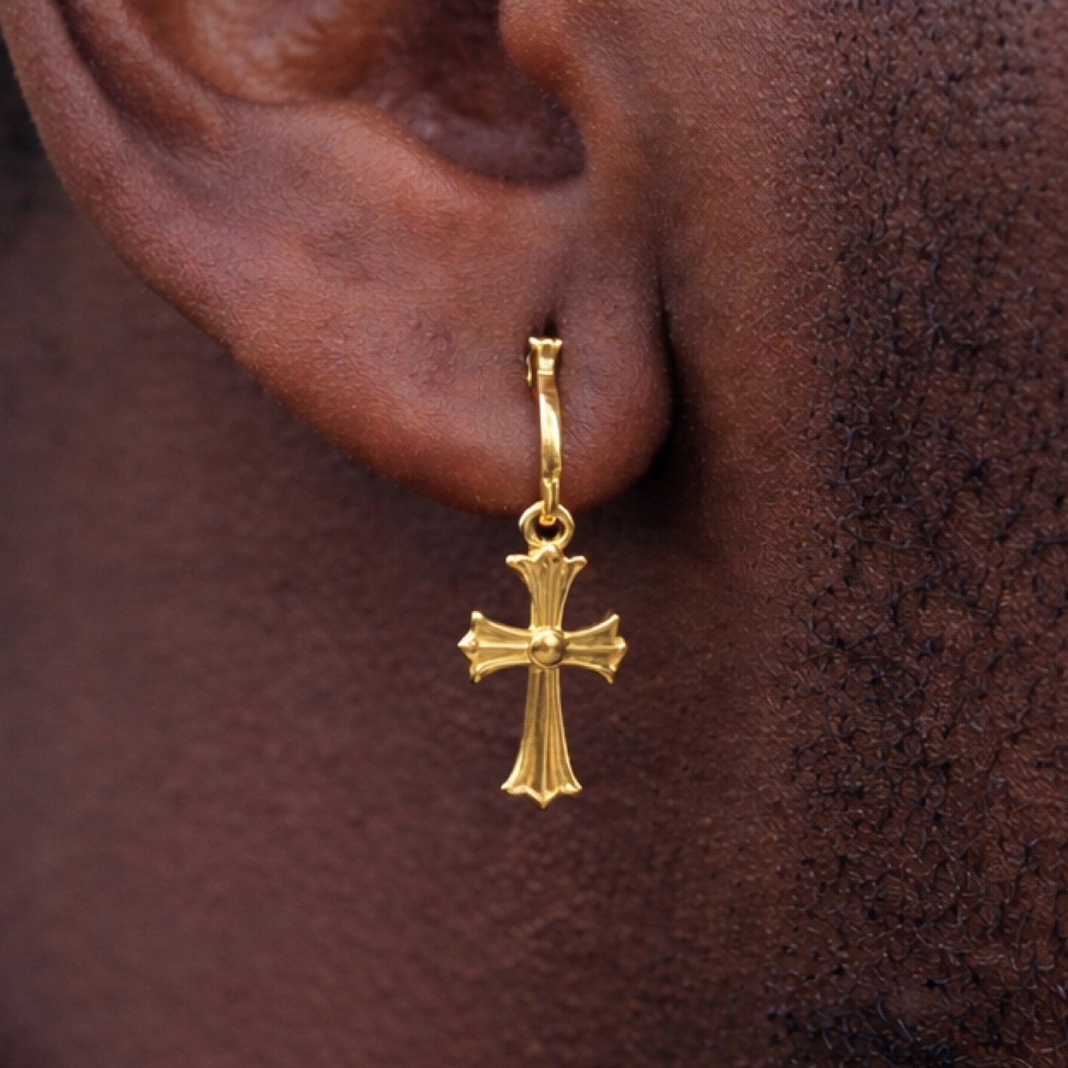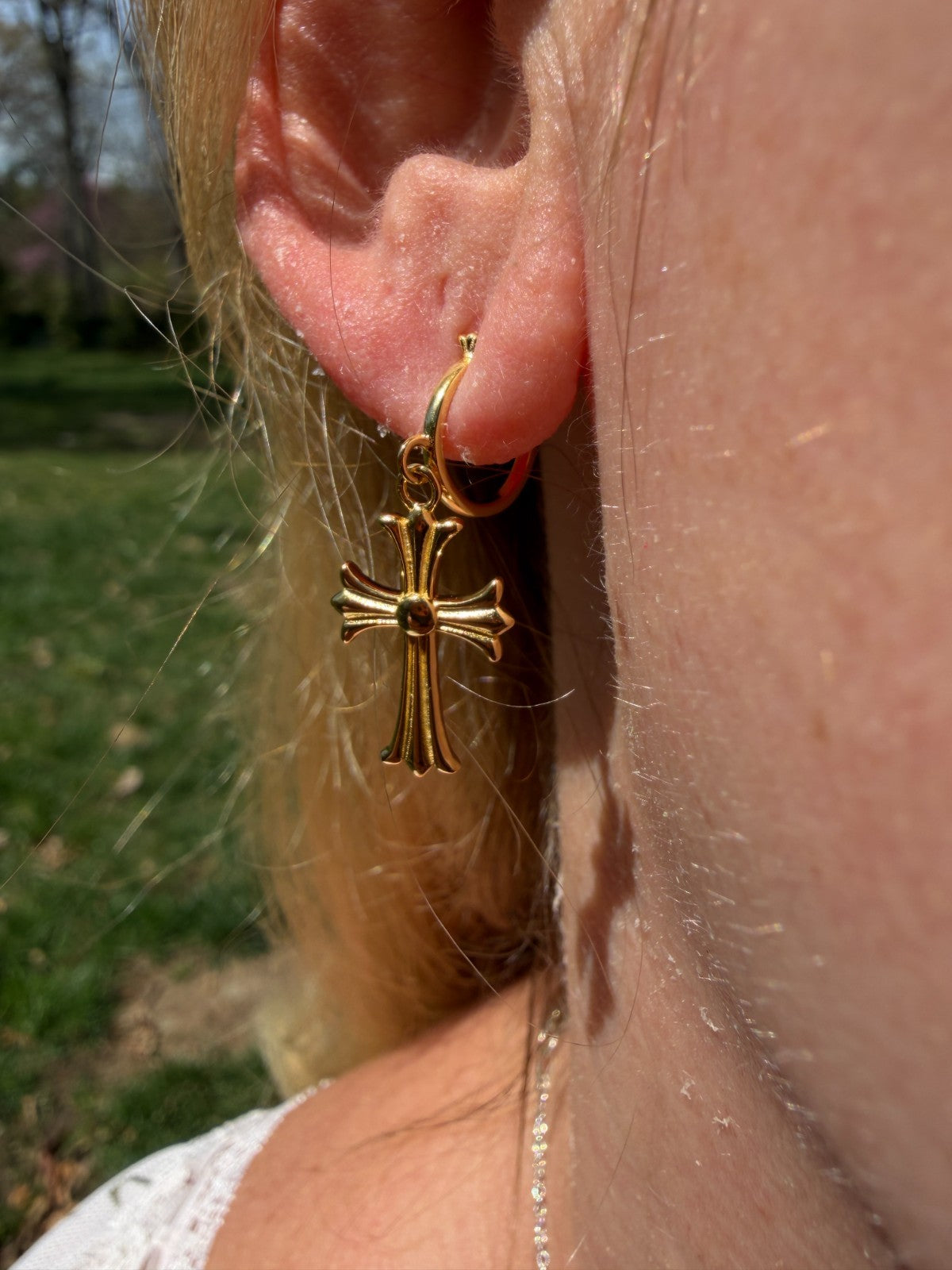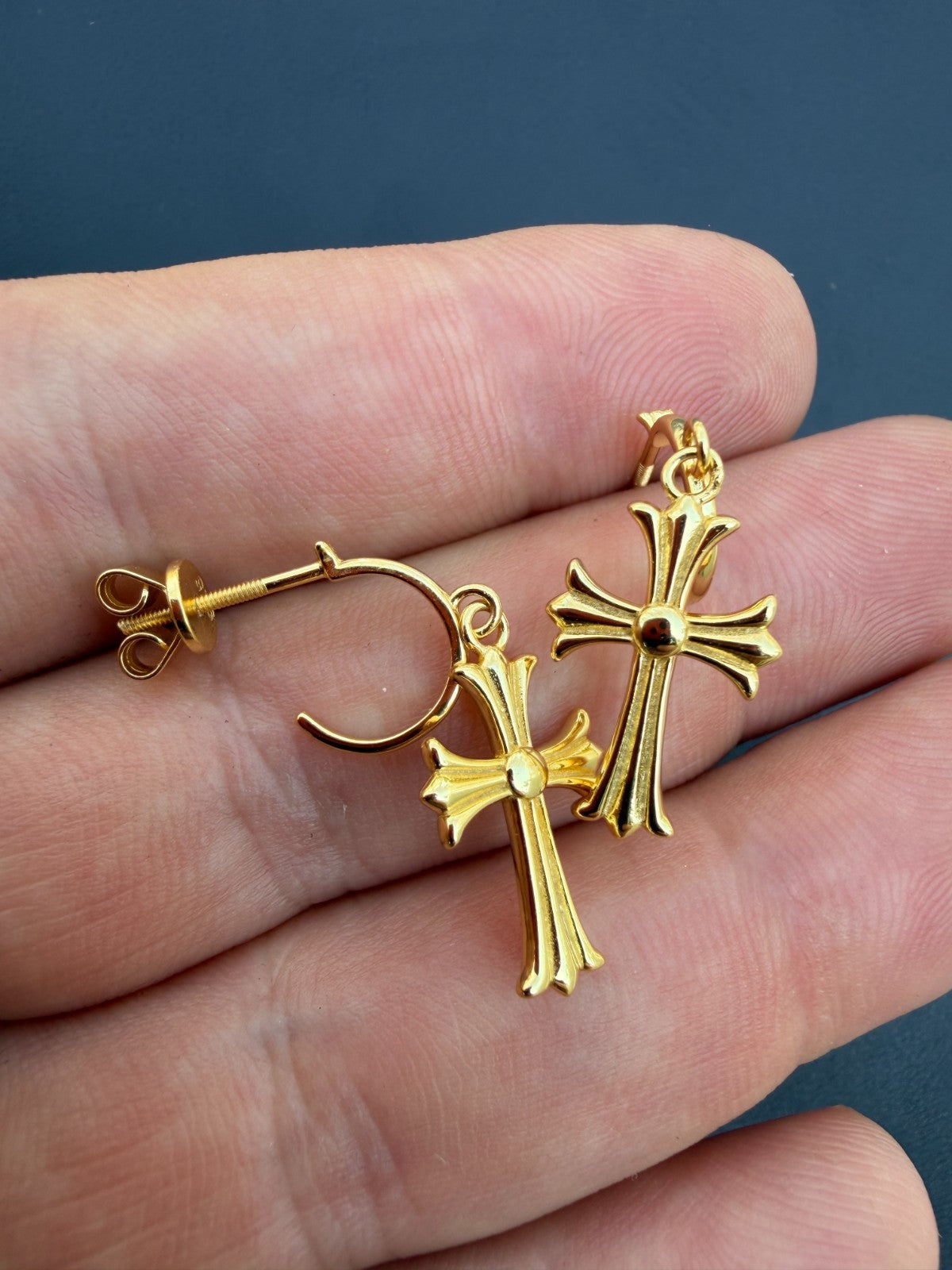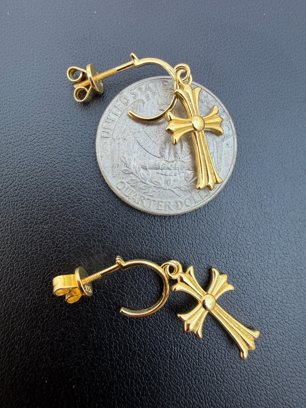 Hearts Of Chrome Huggie Hoops W. Dangle Cross Earrings - 14k Gold Vermeil 925 Silver