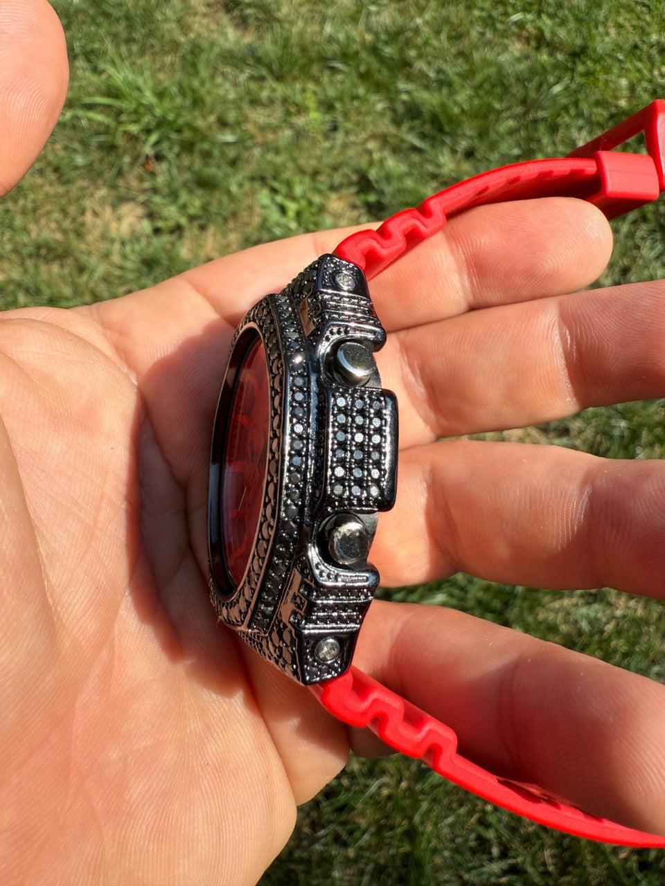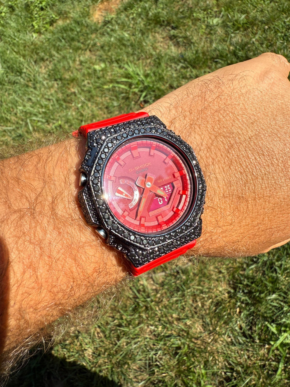Mens iced flooded out moissanite Gshock hip hop watch - classy look! black stones on a red watch