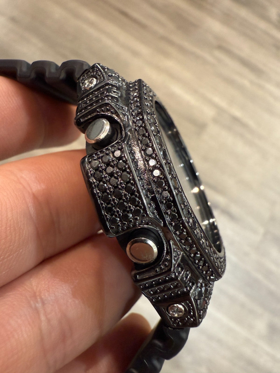 Mens iced flooded out moissanite Gshock hip hop watch - classy black stones on black rhodium metal
