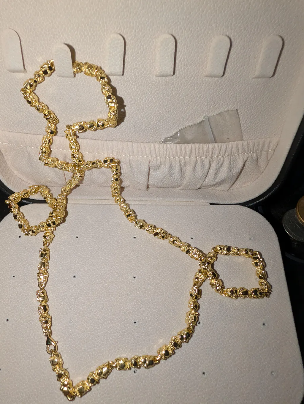 I couldn't be any happier with this chain, it is the perfect size and it's heavy. The sun hits this chain and it screams out pure luxury, the design on the nugget chain is different than what other people are wearing. So, far I have been pleased with the jewelry from Harlem bling and will keep buying from here. The customer service team is responsive and informative.