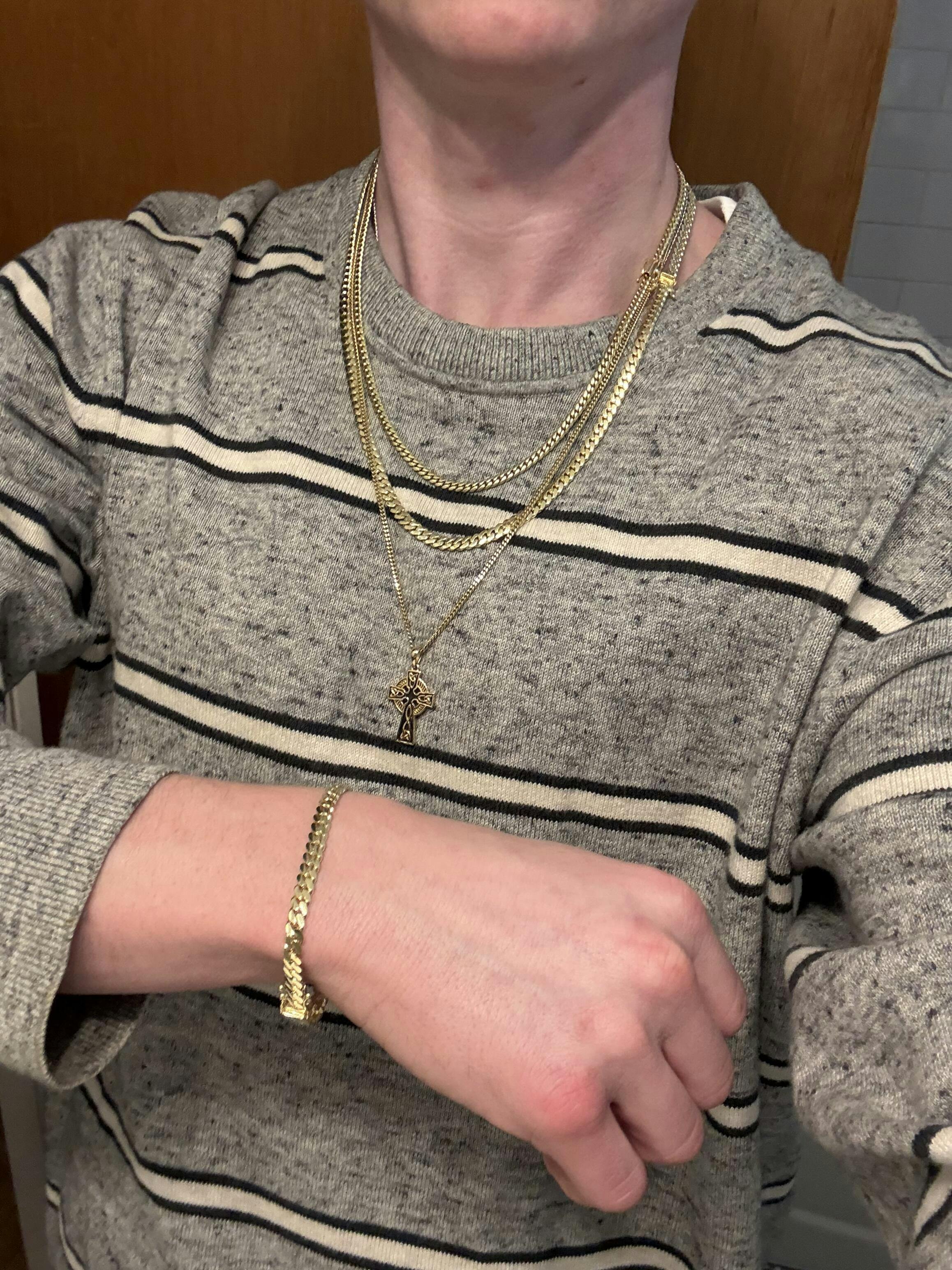 I got the 5mm 10k solid yellow gold 7” bracelet and I liked it so much I got the matching chain too. The chain is 5mm 22” solid 10k yellow gold and the widths match exactly. Quality is great you can see the difference between the machine and handmade by the file on the links. The weight is also correct it’s HEAVY definitely not hollow. Price was great too I got both on two separate sales for 20% off of the original price which is already probably half what a retail jeweler would charge for the same piece. That’s why I’ve been a loyal customer for 3 plus years and will continue to be one. No else one has the same quality for such fair prices or shows the hallmarks in the pictures.