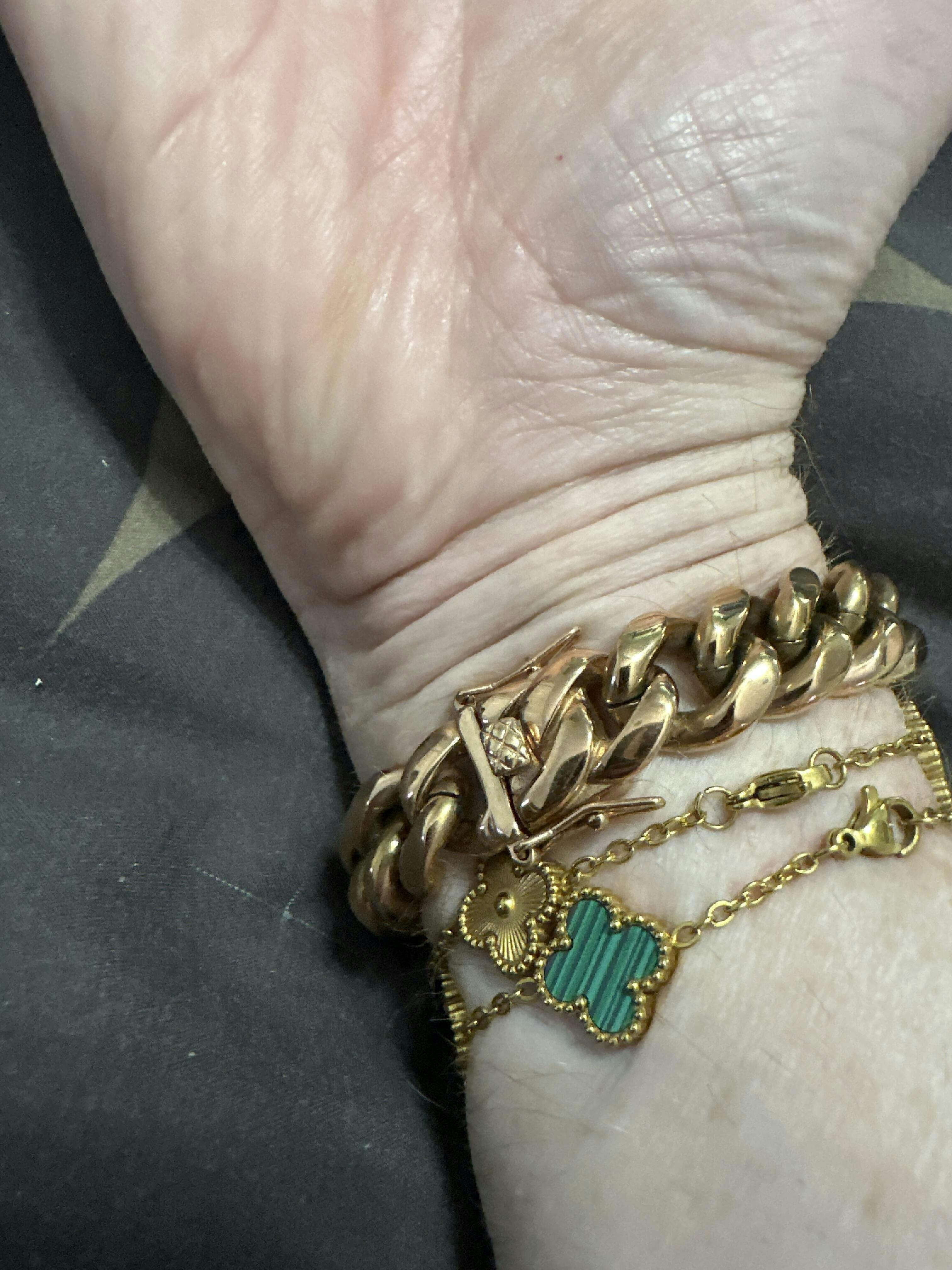 I wear my bracelet all the time. It’s so pretty. I’ve gotten compliments on it too. Shopping was timely and it doesn’t turn my skin. Great buy!