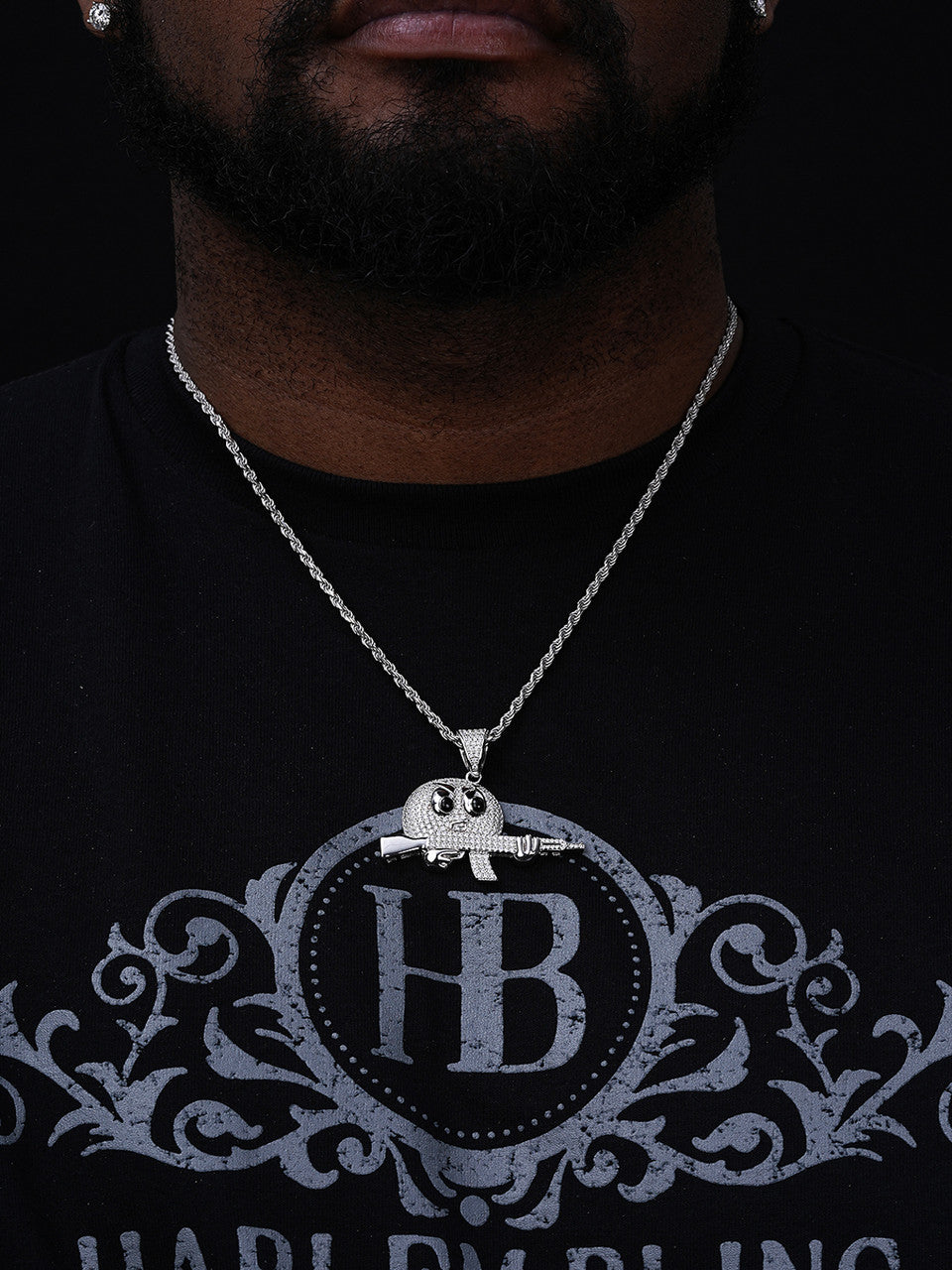 MOISSANITE Angry Emoji W. AK47 Gun Pendant - 14k Gold Vermeil Or 925 Silver - Small 1.5"