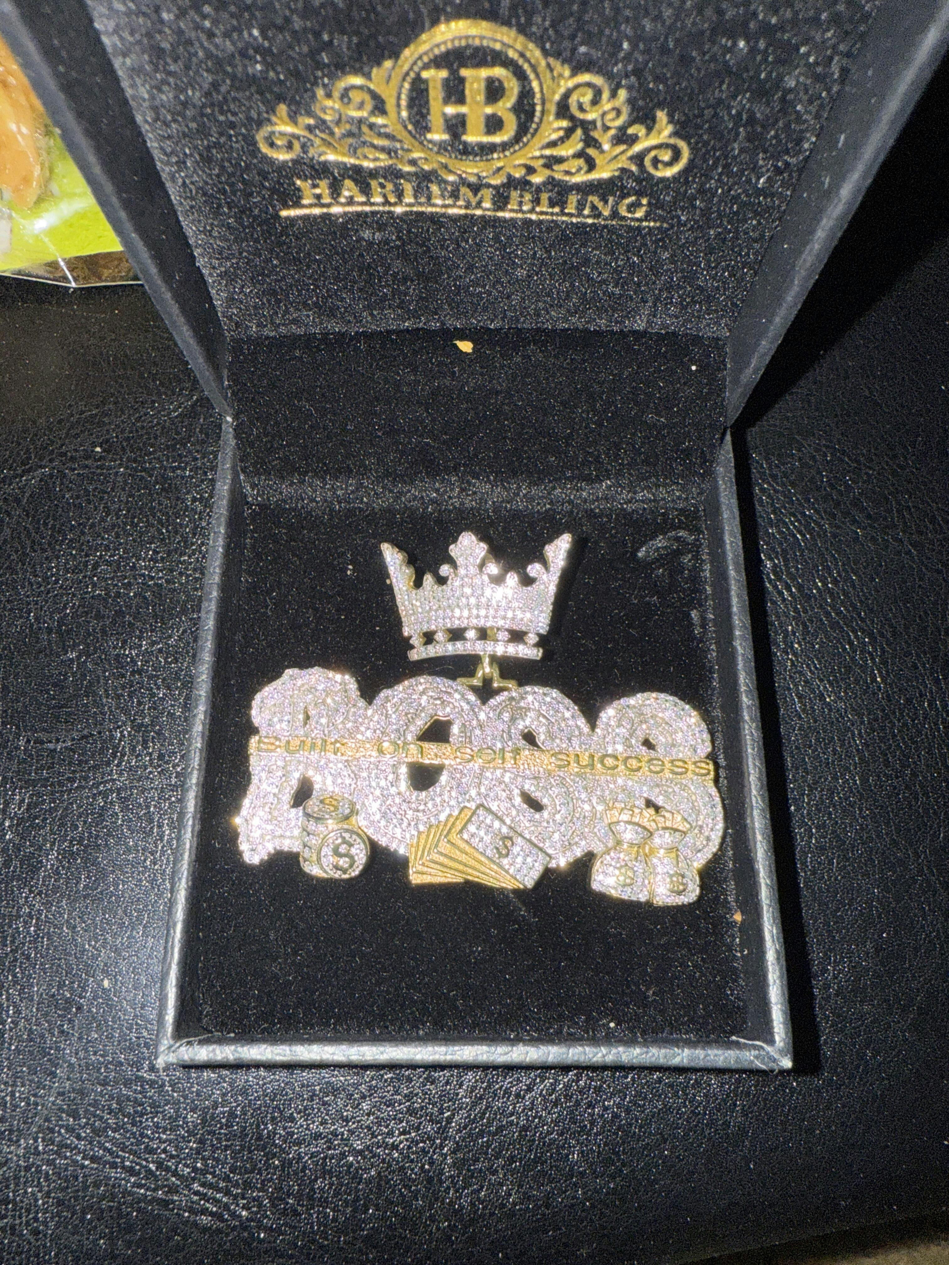 Introducing the stunning MOISSANITE Built On Self Success Iced Out BOSS Pendant by HarlemBling. Available in 14k Gold Vermeil or 925 Silver, this large 2.5" pendant exudes confidence and style. Adorned with shimmering moissanite stones, this piece is a true showstopper. Perfect for those who embrace their boss mentality, this pendant is a symbol of self success and achievement. Choose from a luxurious 14k Gold finish or a sleek Natural Silver finish to suit your personal style. Elevate your look with this eye-catching BOSS pendant, only from HarlemBling.