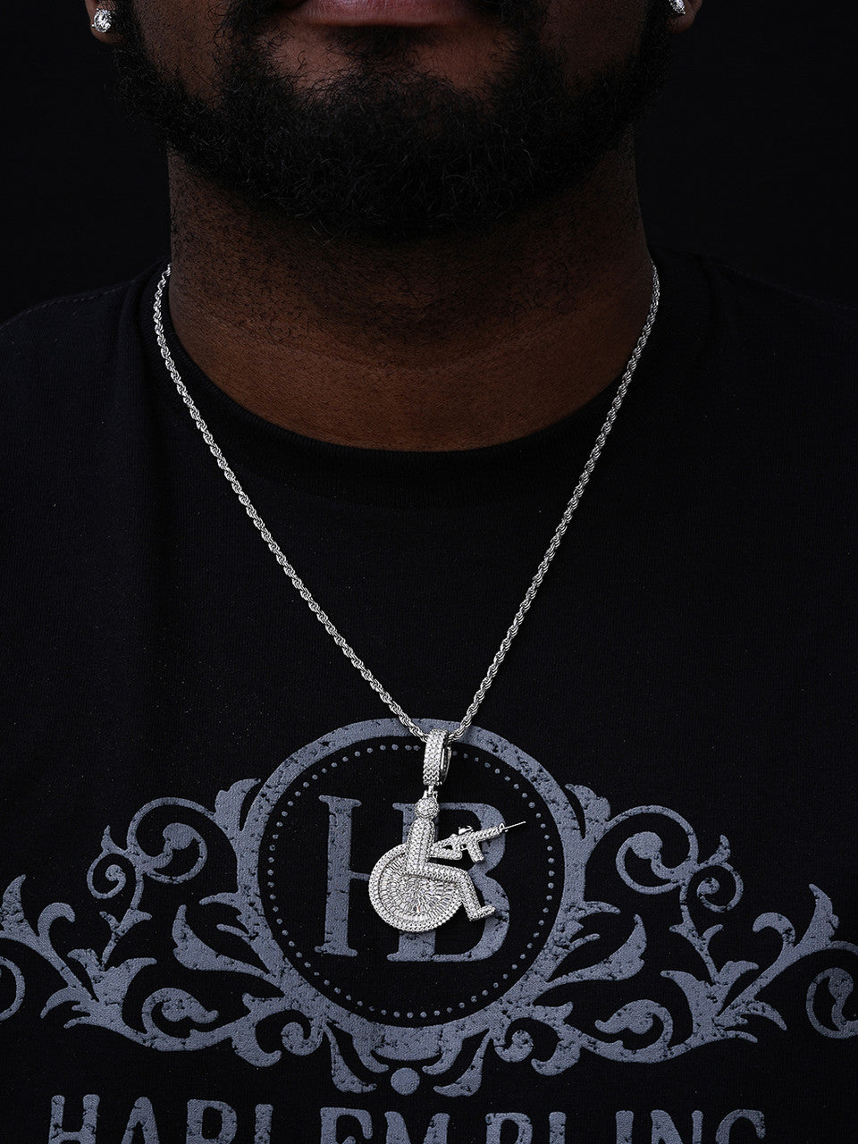 MOISSANITE Crippled Man In Wheelchair & AK47 Gun Pendant - 14k Gold Vermeil Or 925 Silver - Medium 2.25"