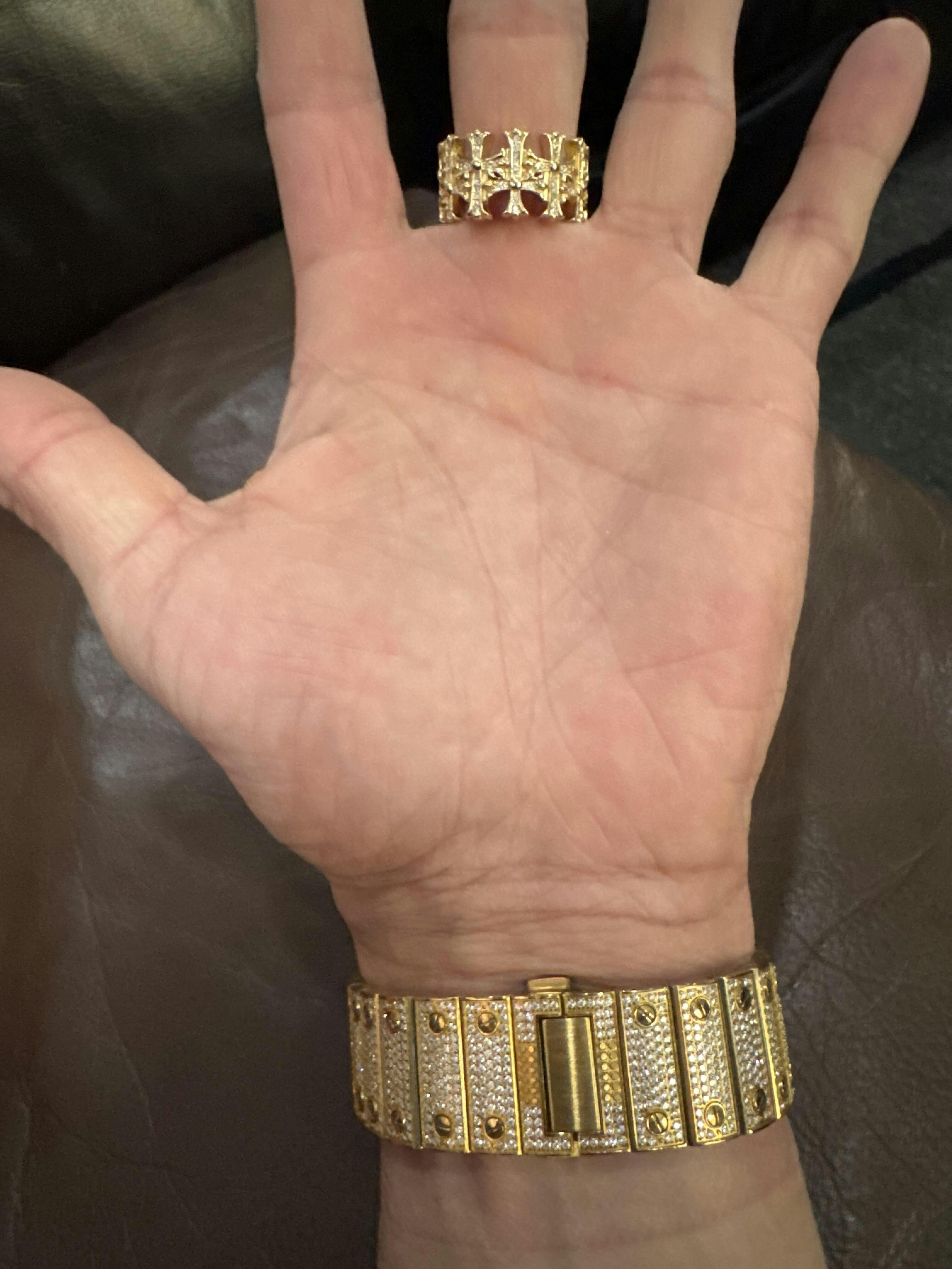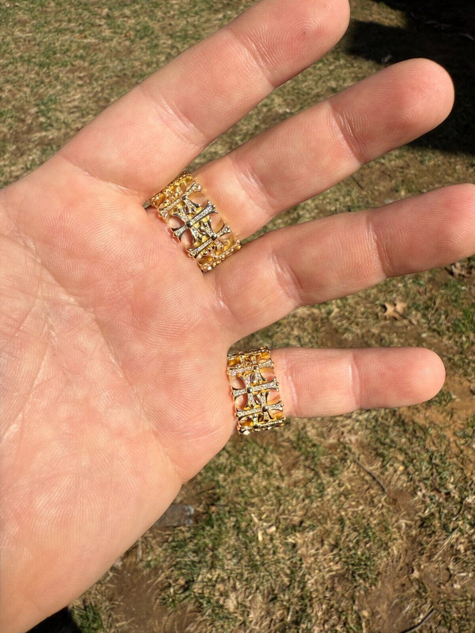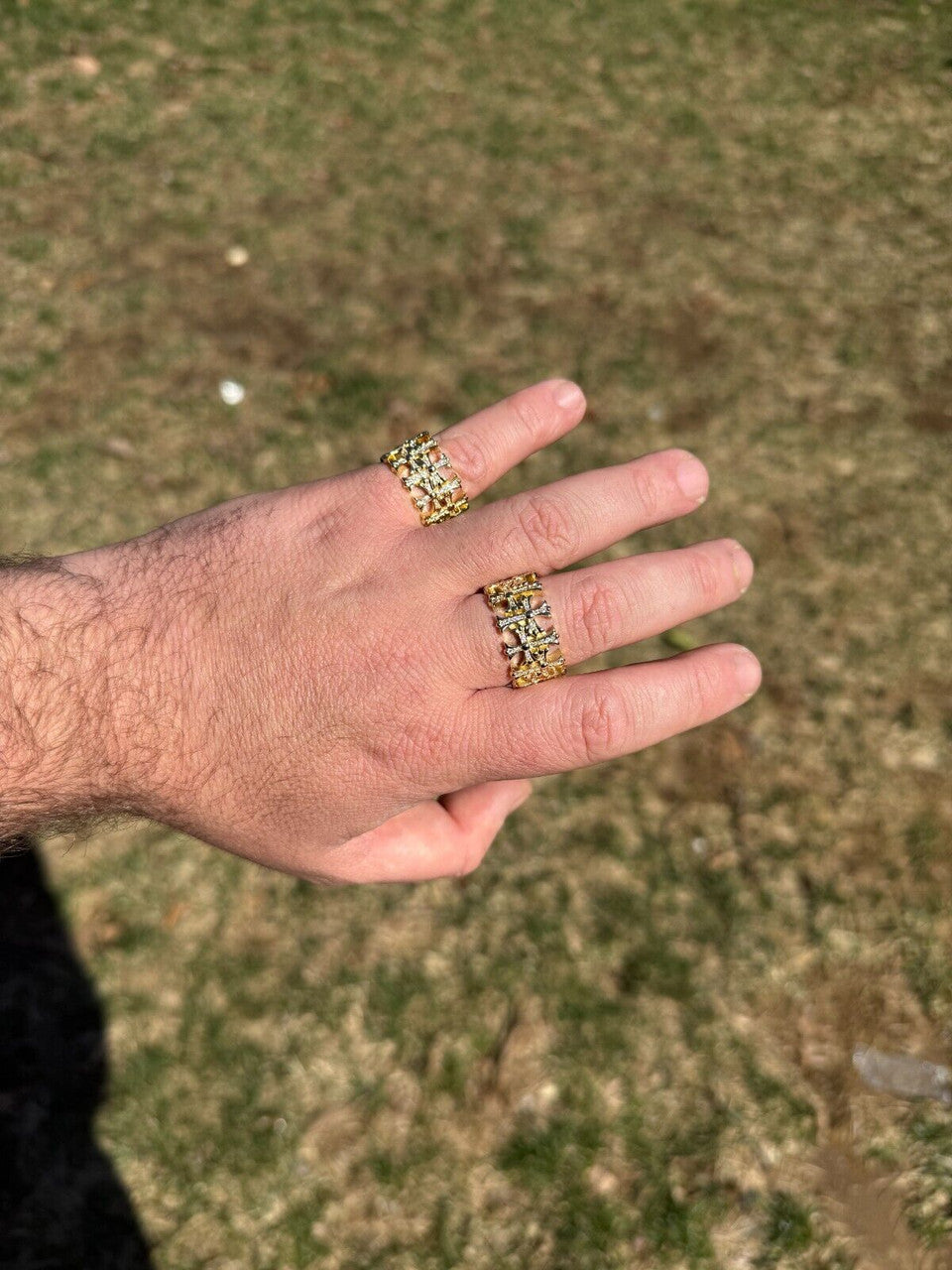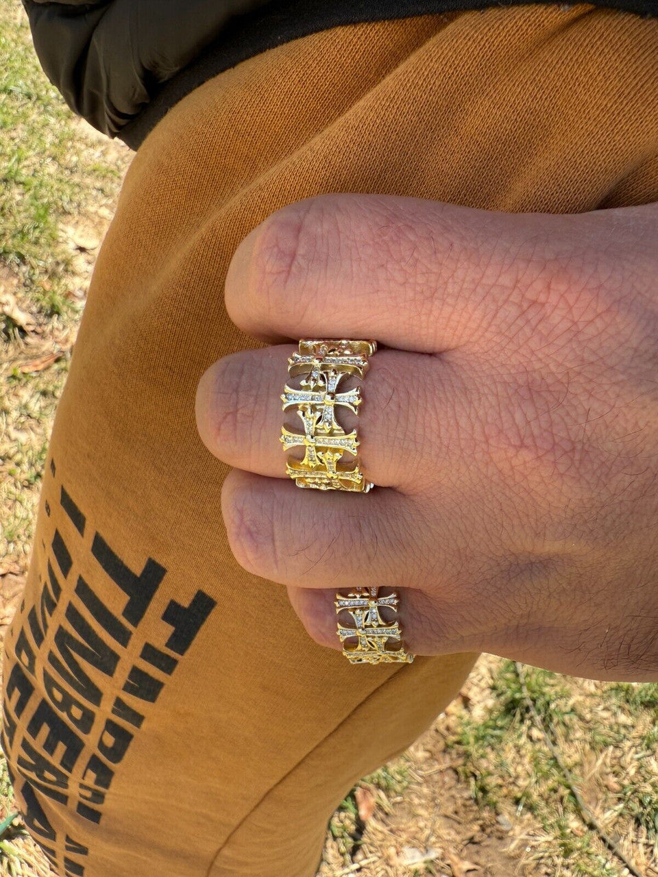 I have to first give a big thanks to Mark and the team for allowing me to return it multiple times. I was way off on the size the first time. Harlem Bling paid shipping both ways and the second one was way too big but a lot closer but this was my fault, I used some print out ring sizer. They again paid shipping both ways for a second return. I now have a size 11 and right before it came I got some plastic ring sizers you can request for free from a few jewelers and I knew the 11 would fit and it did, a 10 1/2 might fit a little more snug but there are no half sizes as it would probably make the seamless design impossible. There’s a little wiggle room but it’s not going to fall off or anything and requires a decent pull to get it over my knuckle. It looks great especially with my Harlem Bling watch! It is stamped 925 too, took me a while to find it but once you see it it’s like finding Waldo, IYKYK. Would hit harder if I had the stones on all sides tennis bracelet 😏
