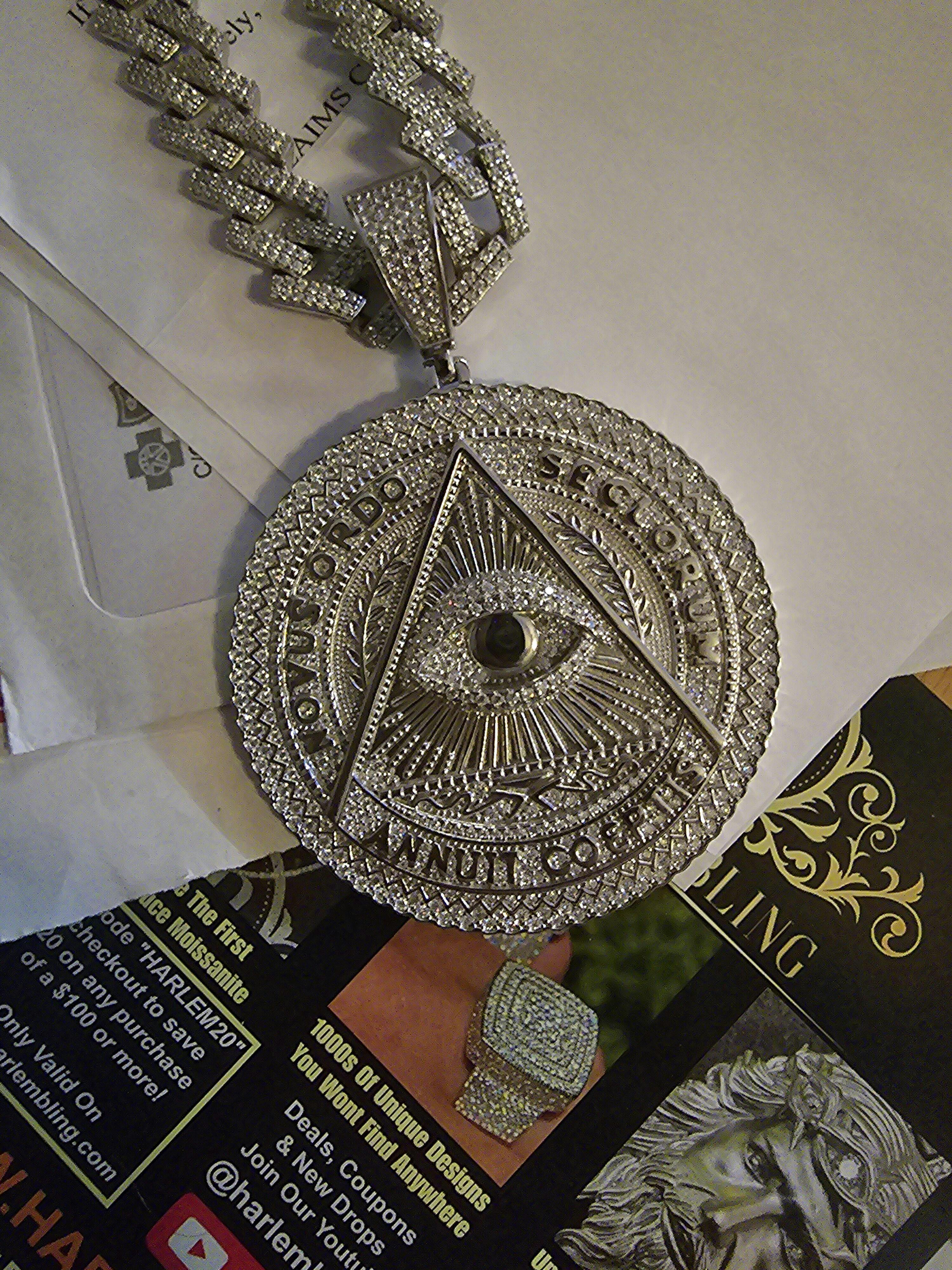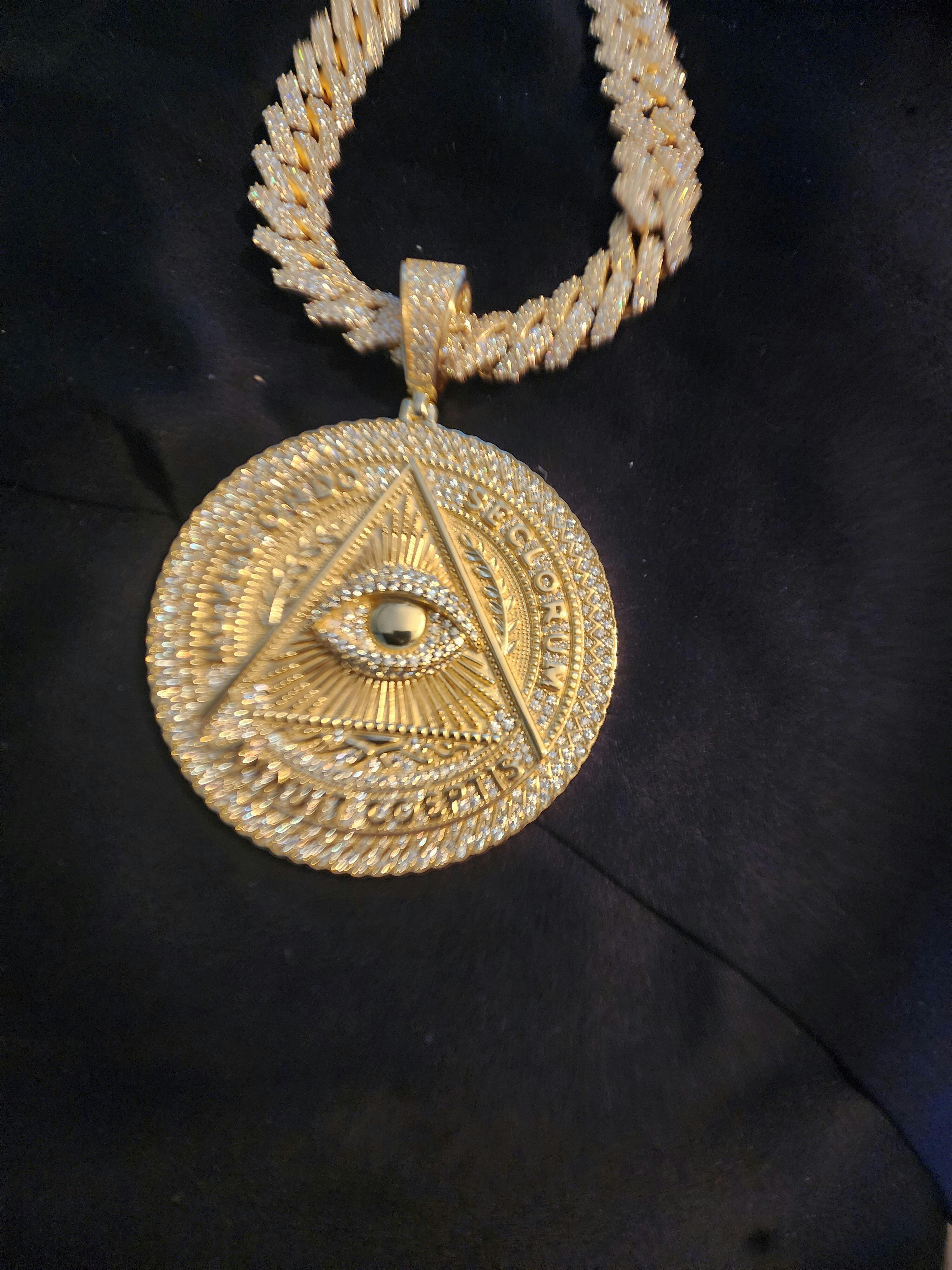I HAVE TO SAY IM IMPRESSED I BOUGHT THE 3 INCH JESUS HEAD AWHILE BACK WISH IT CAME WITH THE MOISSANITE DIAMONDS ON THE SLIVER ONE LIKE THIS HOWEVER ITS NOT ILLUMINATI.....IT REPRESENTS UR SPIRITUAL SIDE AND BEING AWOKE AND OR AWARE OF WHATS REALLY GOING ON RENAME THE ITEM TO THE THIRD EYE 👁 however love the beautiful peice tho
