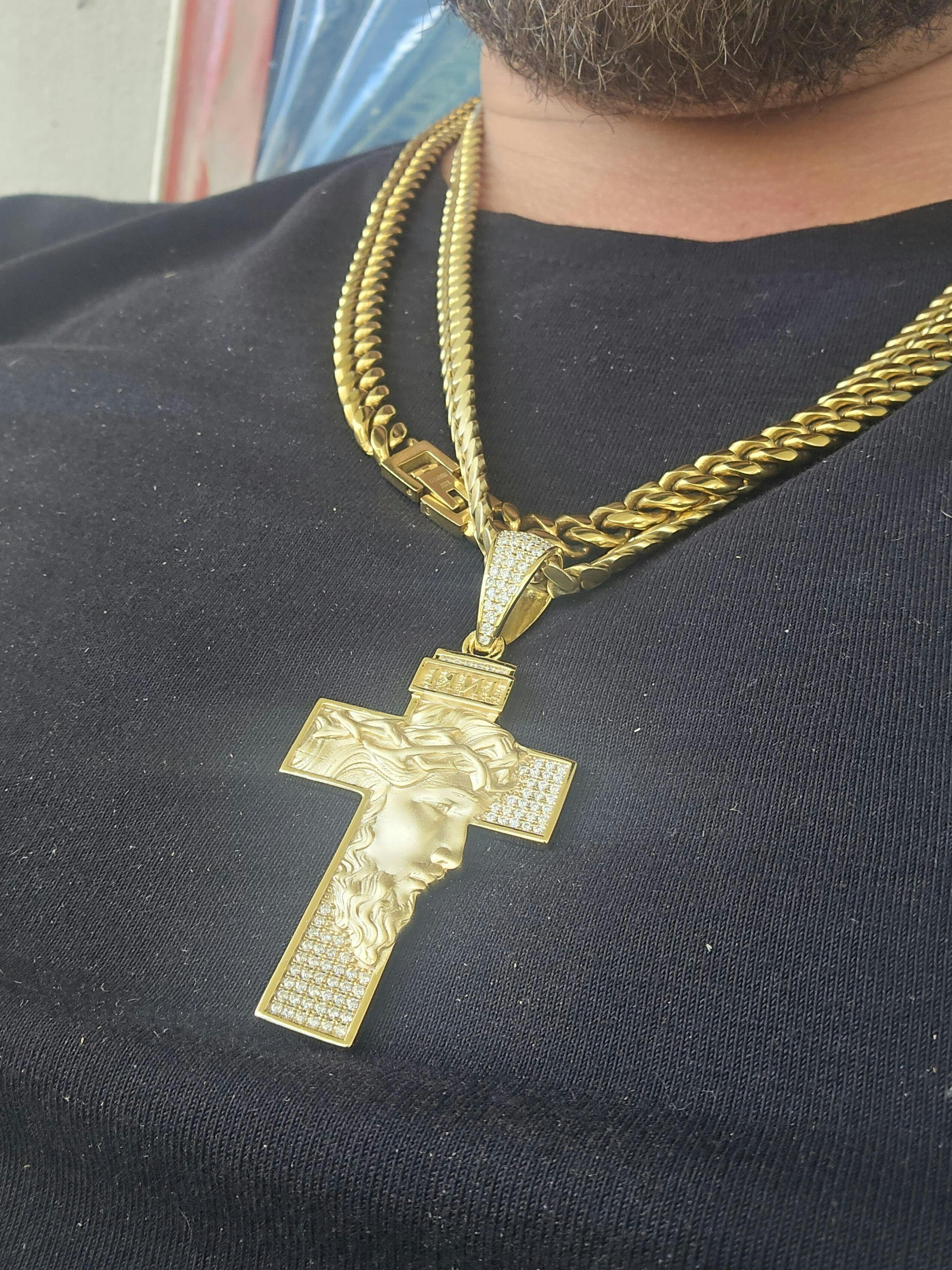 MOISSANITE Jesus Face On Cross Pendant - 14k Yellow/Rose Gold Vermeil Or 925 Silver - Large 2.5"