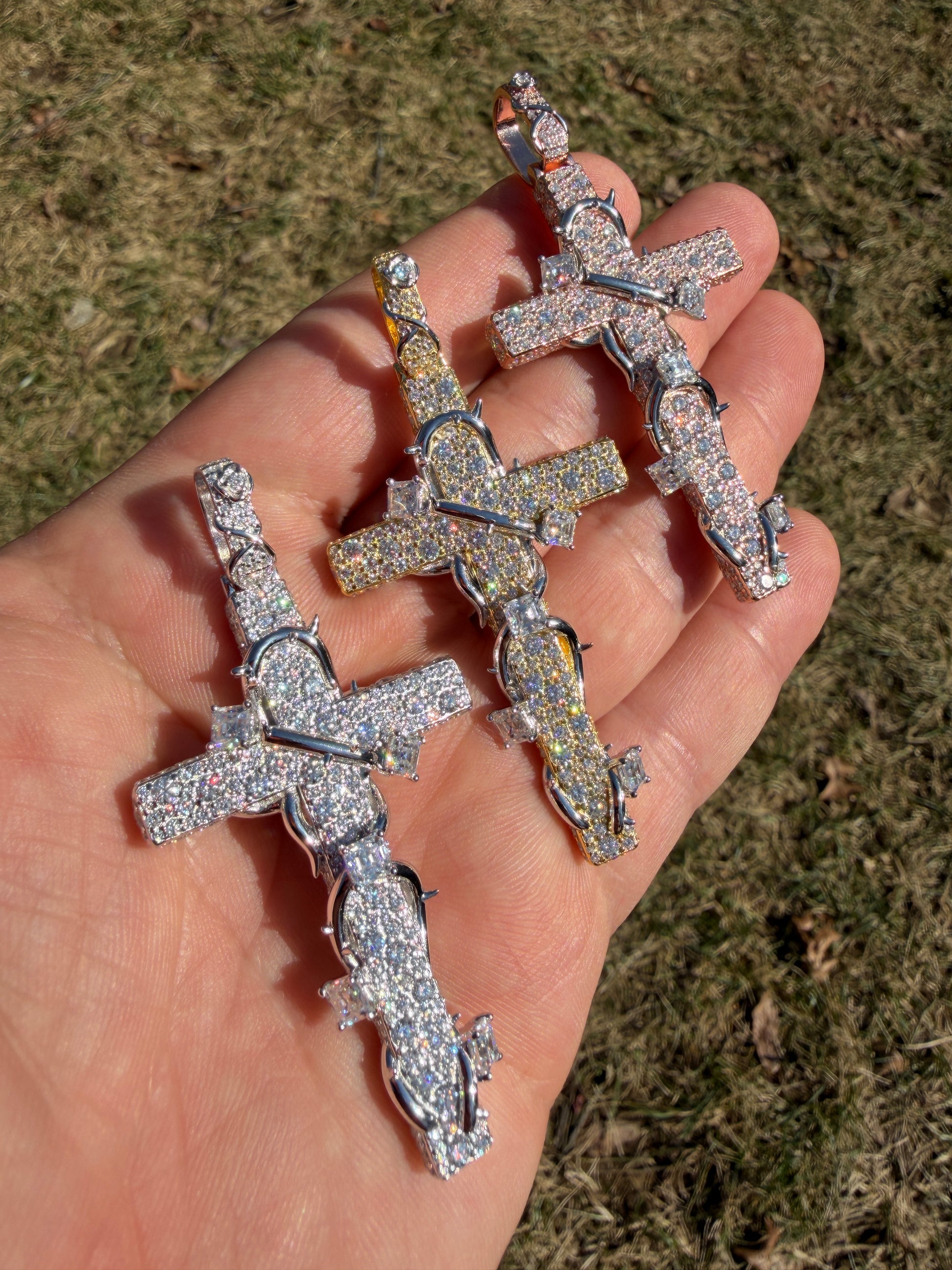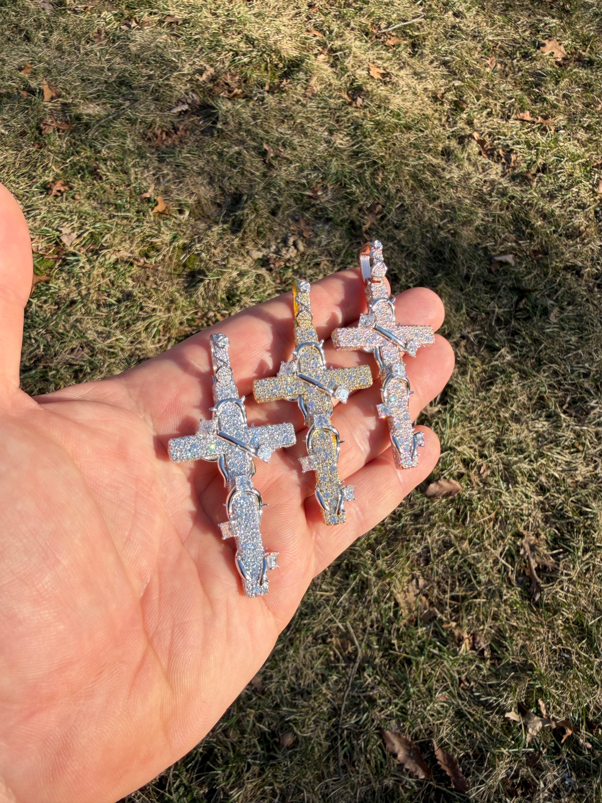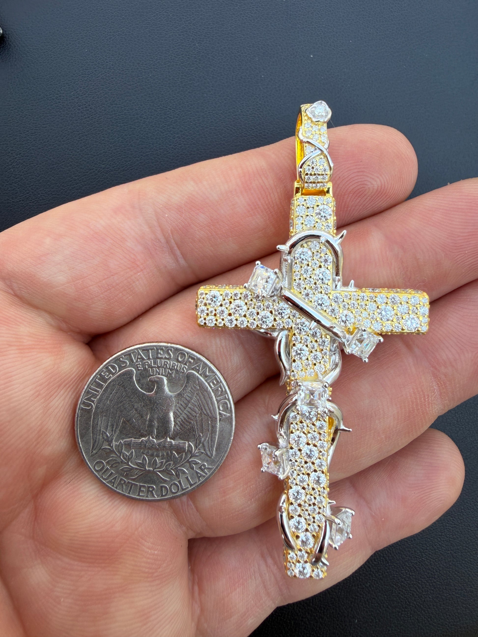 MOISSANITE Mosaic Setting Iced Cross W. Thorns Pendant - 14k Yellow/Rose Gold Vermeil Or 925 Silver - Large 2.75"
