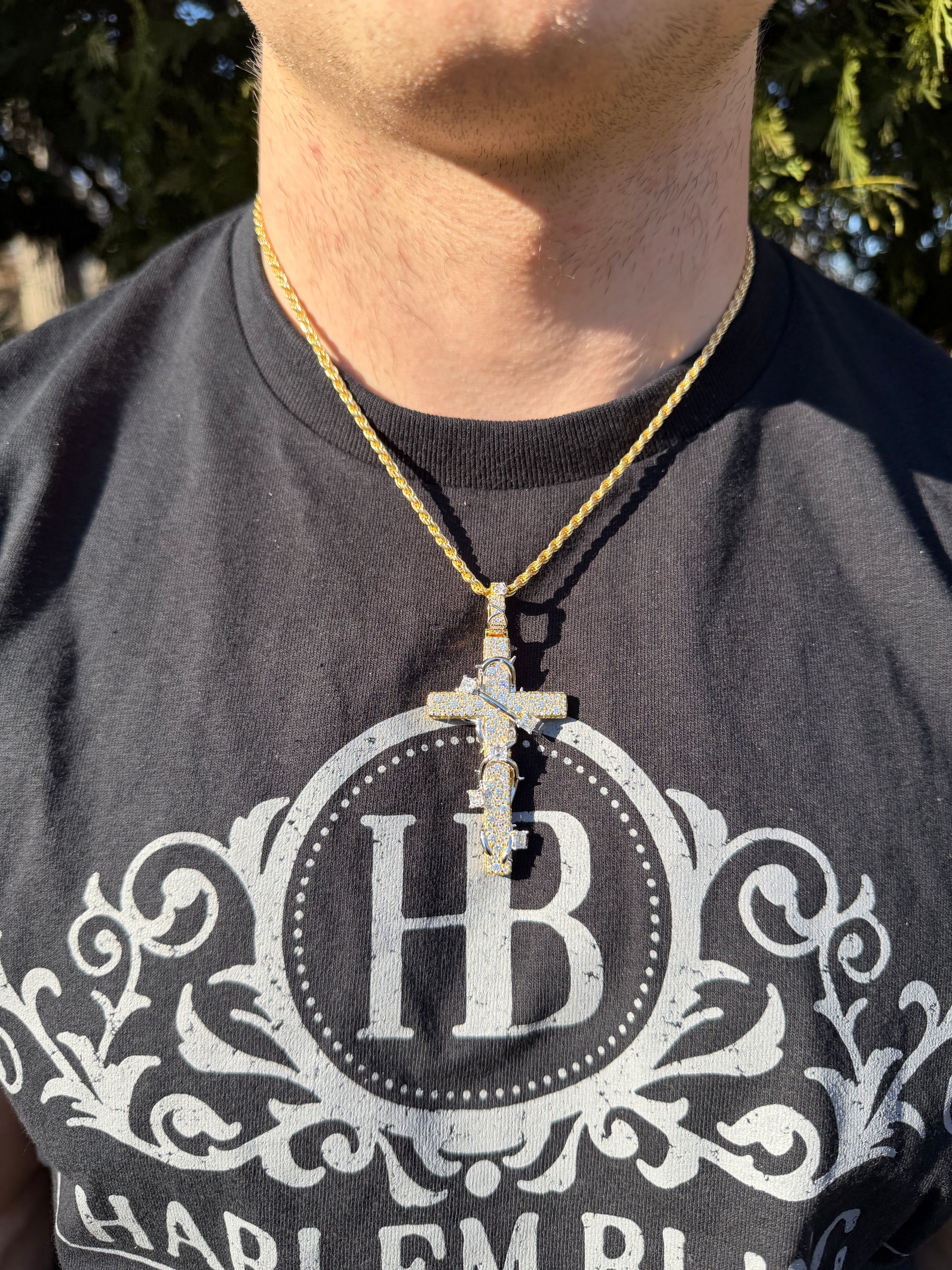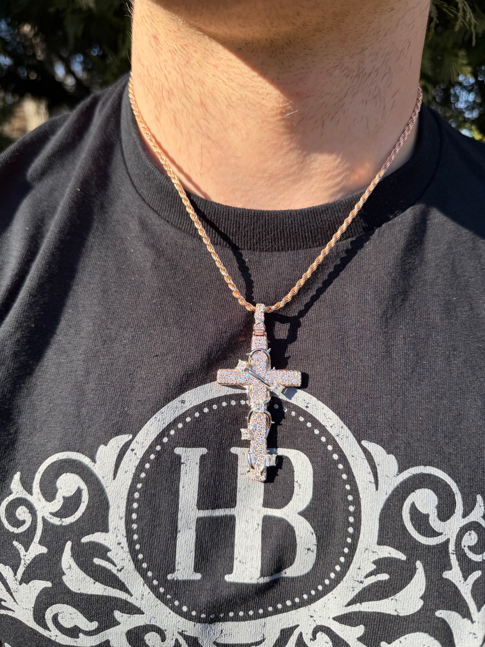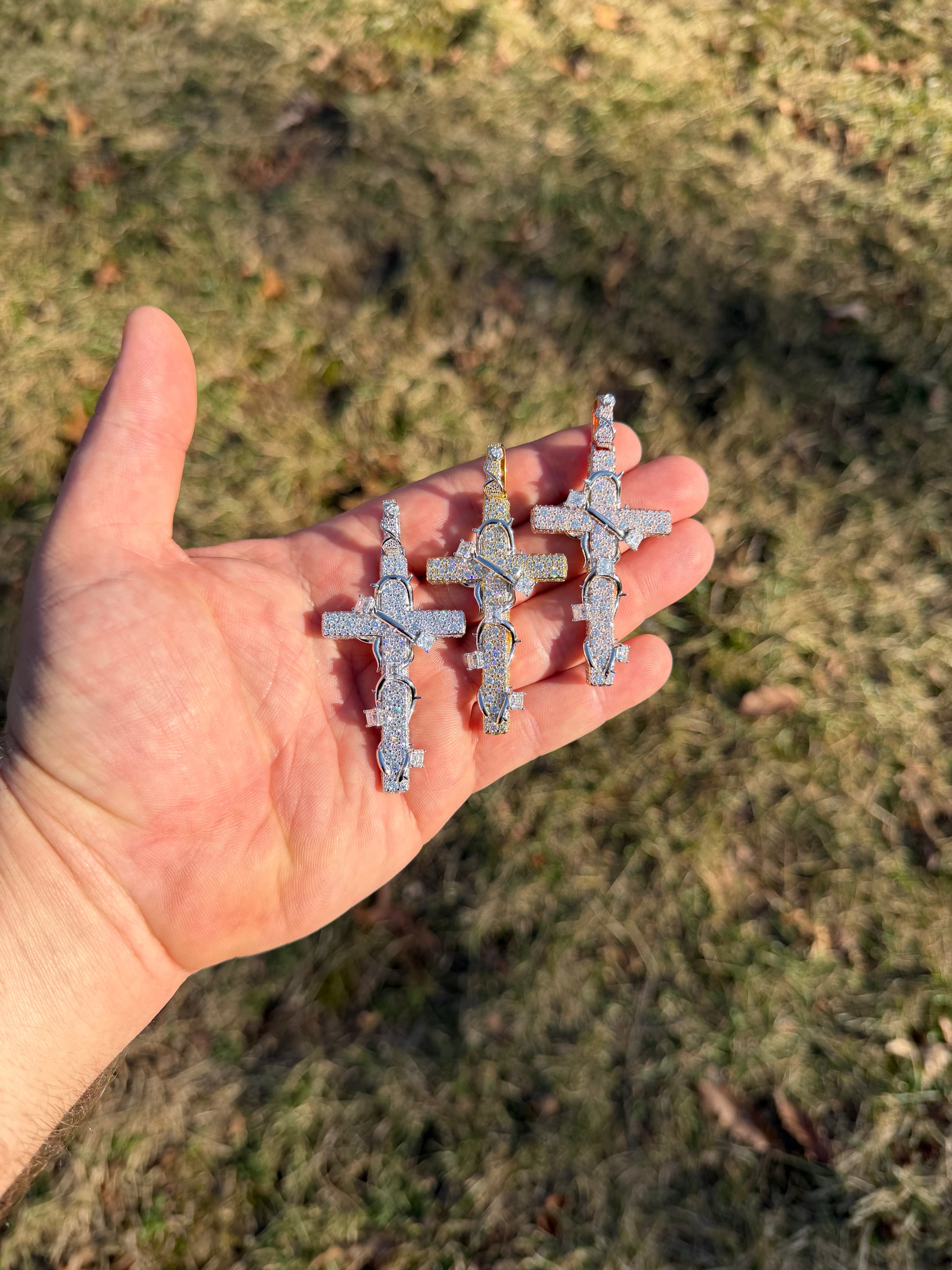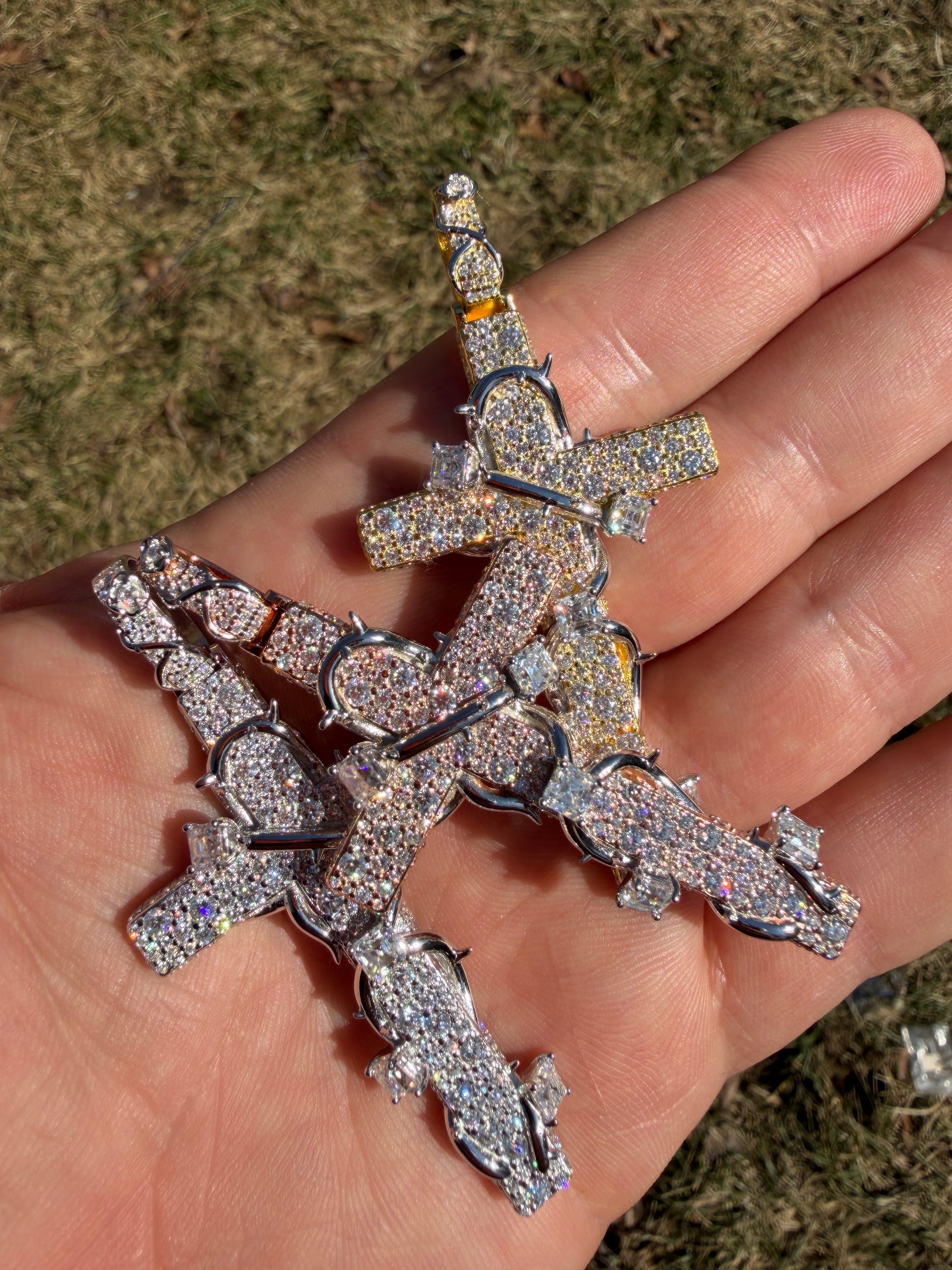 MOISSANITE Mosaic Setting Iced Cross W. Thorns Pendant - 14k Yellow/Rose Gold Vermeil Or 925 Silver - Large 2.75"