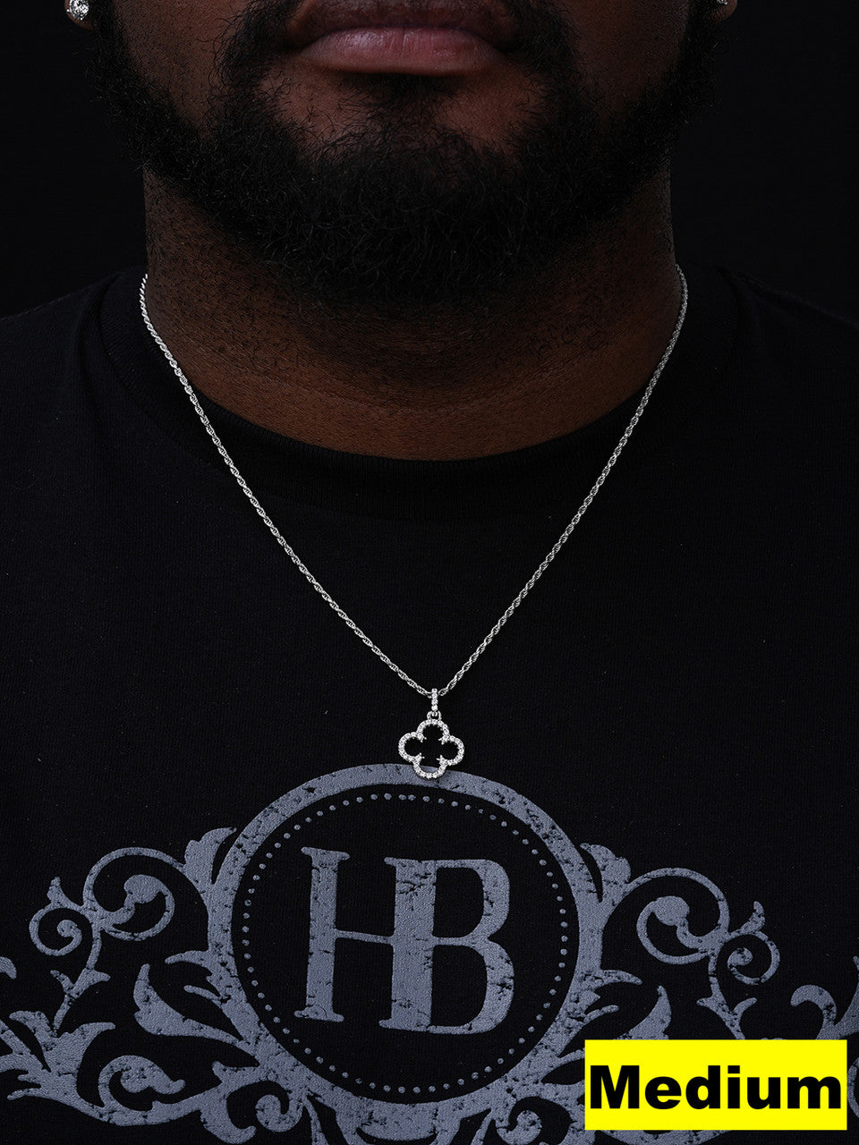Medium is 0.75" (1" w bale) & weighs 2.4 grams (fits chains up to 3mm thick) 0.65ct moissanite