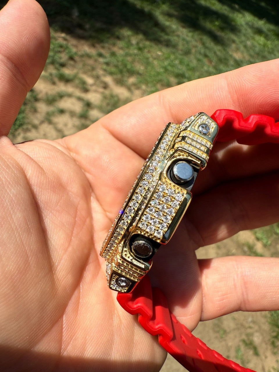 Mens iced flooded out moissanite Gshock hip hop watch - amazing contrast of gold with red silicone band