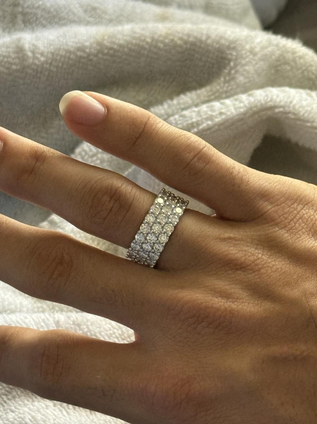 Gorgeous ring which seems very sturdy and resistant to every-day life. Sparkles like crazy in the sun and in any bright light. Stones are slightly larger in person than one would expect. Prongs seem reliable, but be warned that they might cause discomfort to adjacent fingers in some circumstances. Overall I absolutely recommend.
