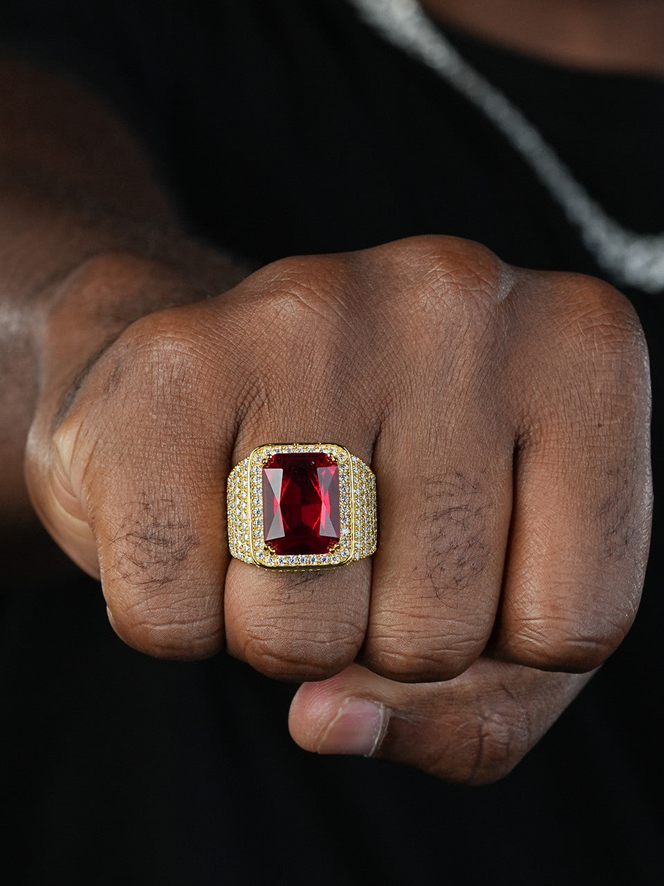 Nice large rectangular man made ruby stone surrounded by man made diamonds
