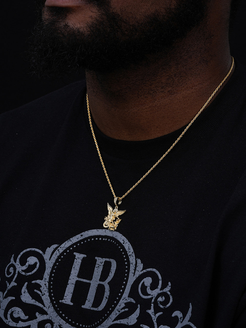 Saint Michael Archangel Slaying Dragon Pendant - 14k Yellow Gold Vermeil Or 925 Silver - CZ Stones - Small 1.33"