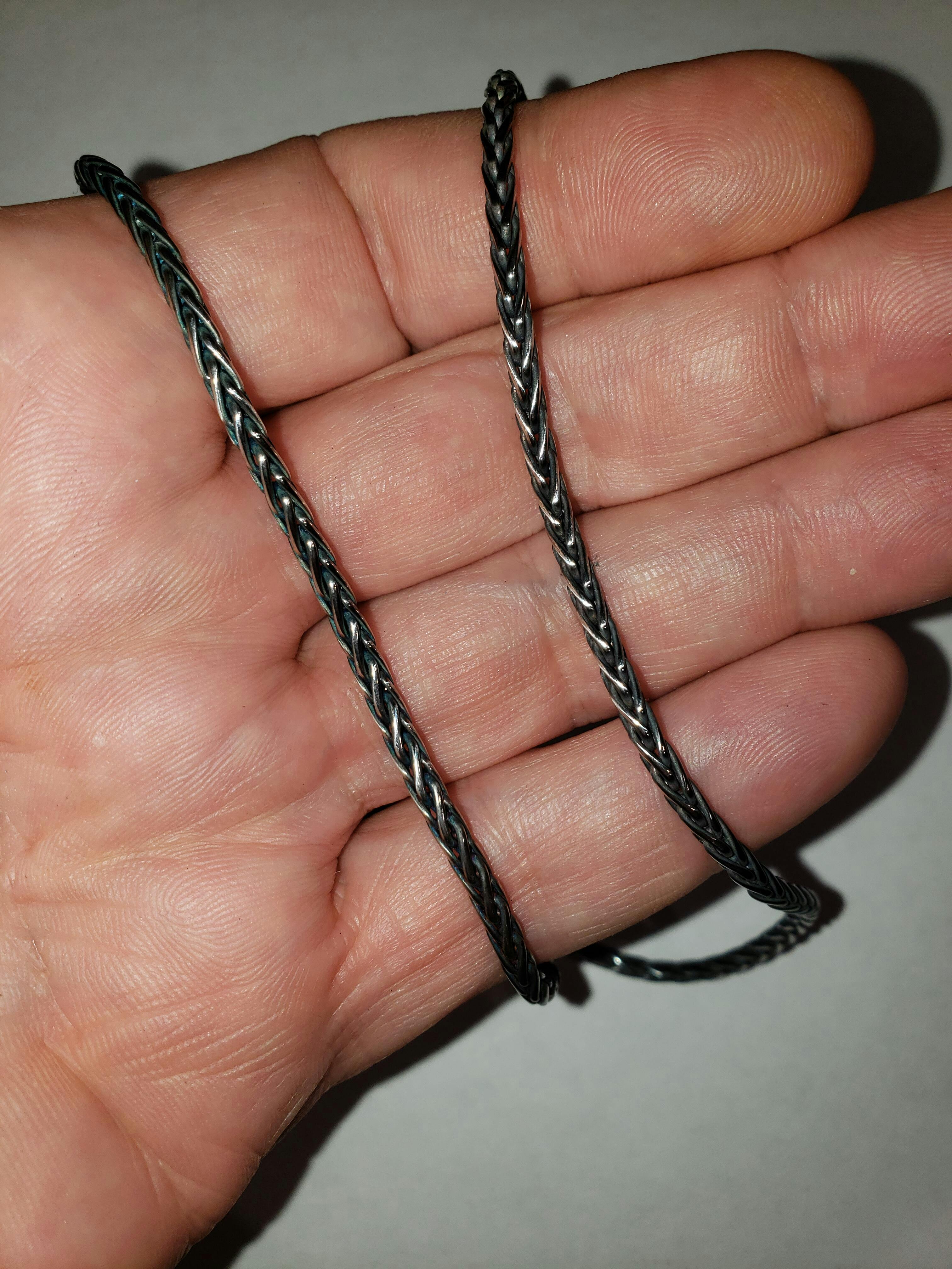 I bought this chain, because everywhere I searched I could not find a Spiga Wheat Rope Chain that match the weave chain I got from Italy. I received the chain on time in a beautiful box. Then I tried myself to antique my new chain with distilled vinegar replicating what I saw on line. It went horribly wrong after 14 hours soaking it came out looking fake. Not kidding it looked like in some places like the varnish came off. Frantic I too it to my coin store and they laugh at how it looked and tested it. It was just as advertise. Then they directed my to a fine jeweler whom cleaned it and they kindly antique it for me. And boy did it come out spectacular! The jeweler advise, should I do it again to use Liver of Sulfur, but I rather just leave up professionals like Harlem Bling. I could not be happier with the purchase from Harlem Bling. Leave it up to the professionals, lol.