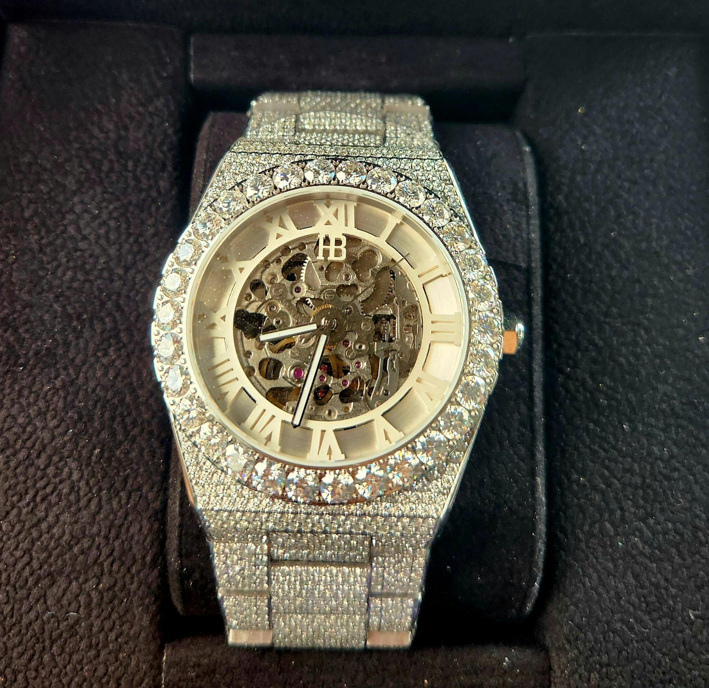 35.5ct MOISSANITE Automatic Skeleton Watch Mens Real Iced Hip Hop Passes Tester
